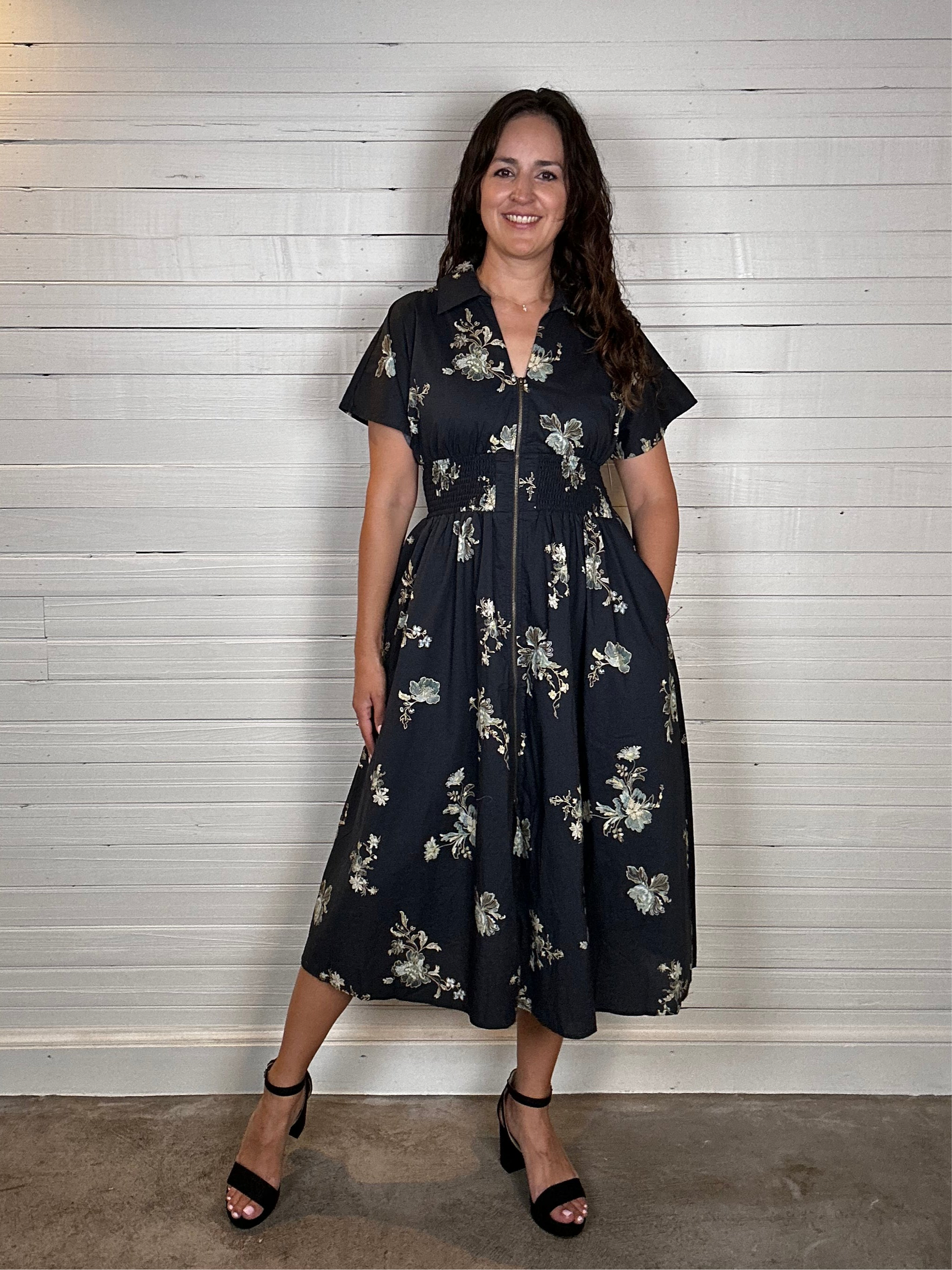 This Harlow Midi Dress in Black Floral features a smocked waistband that offers a flattering fit and a full front zip for easy wear. Crafted from lightweight woven fabric with a non-sheer lining, it ensures comfort and coverage throughout the day. The short sleeves and side pockets combine style with practicality, making this dress an elegant yet functional choice for warm weather occasions.