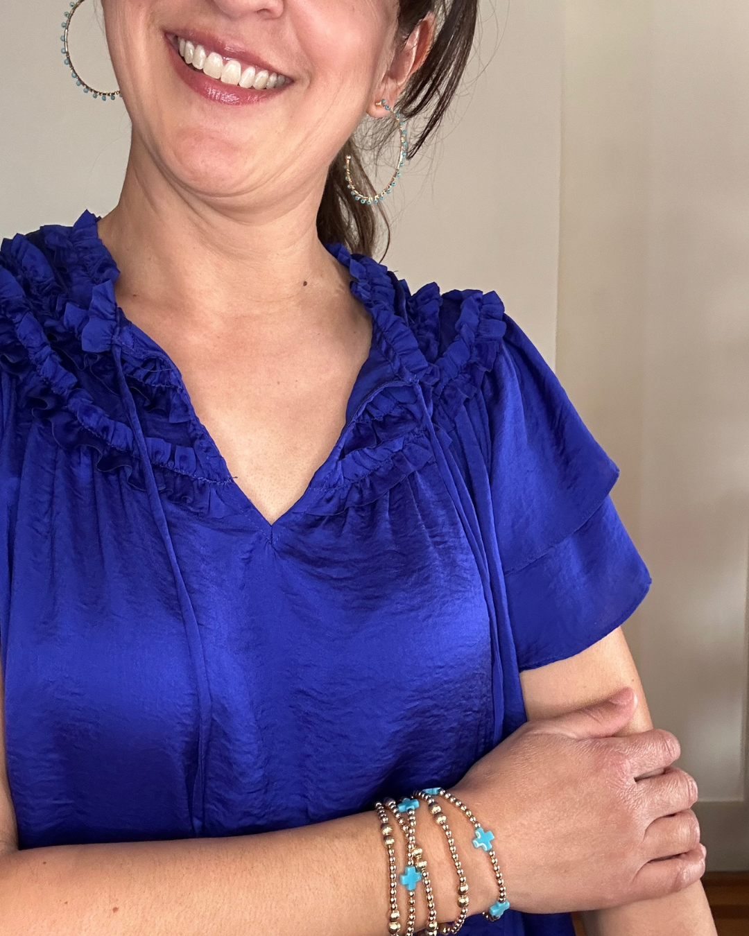 Expertly crafted for effortless style, the Harmoni Short Sleeve Top in Dark Blue exudes sophistication. The solid v-neck and ruffle sleeves add delicate detail, while the self tie at the front creates a flattering silhouette. Made from a lightweight, non-sheer woven material, this top is perfect for any occasion.