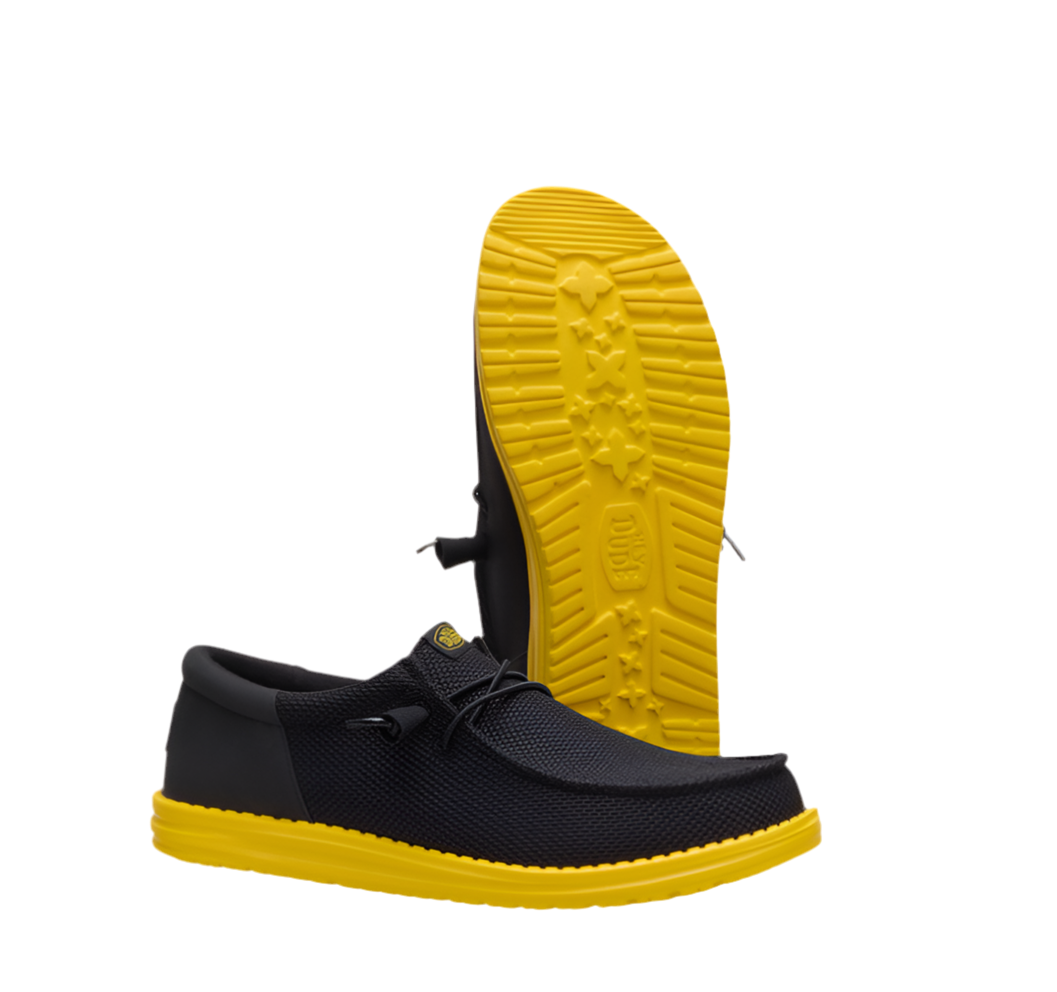 Bring nonstop fun to your feet with the HEYDUDE Wally Funk Pop in Black & Yellow. Featuring a breathable mesh upper and a soft microsuede heel cap, these shoes blend structure with cozy comfort. The vibrant sole adds a splash of color while staying lightweight, flexible, and cushioned for all-day bounce. With stretchy laces and easy slip-on design, you can skip the hassle and dive straight into your day with style and ease.