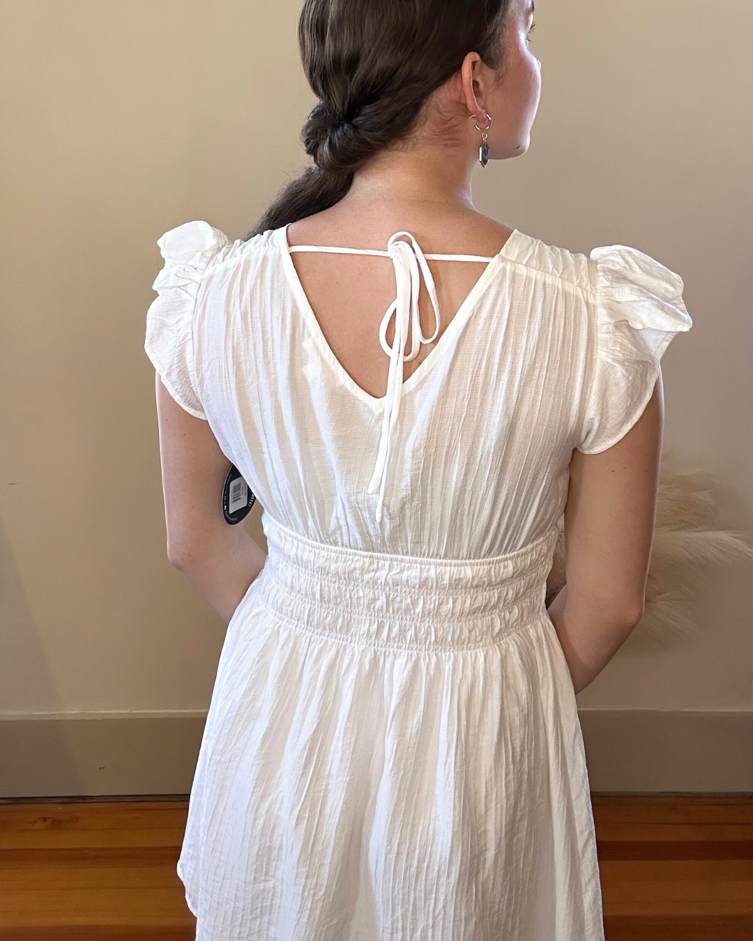 Experience effortless elegance with our Lovely Mini Dress in white. Featuring a v-neckline, ruffle sleeves, and an elastic waist, this lined dress exudes timeless style. The perfect choice for any occasion.