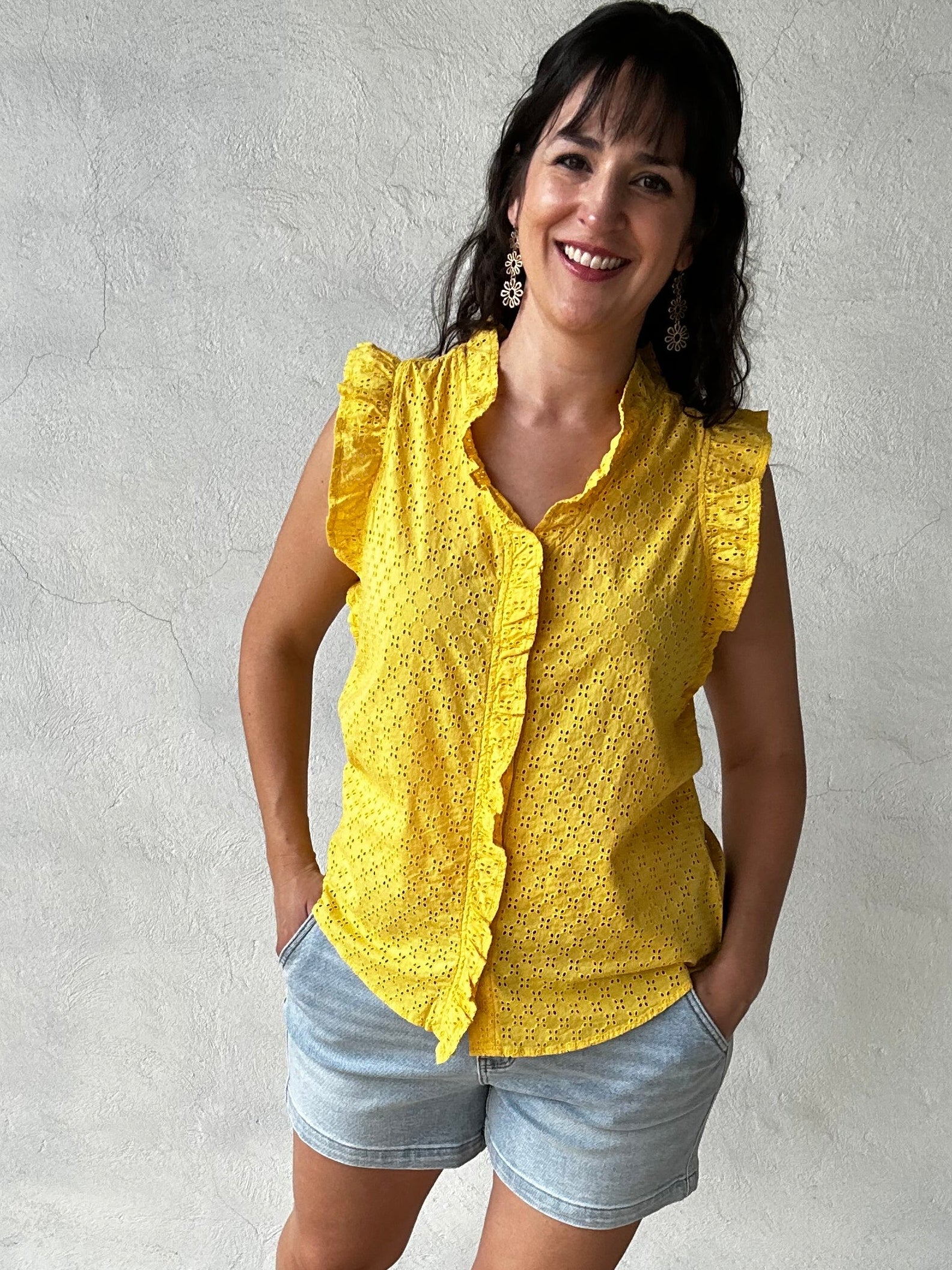 Brighten your wardrobe with this cheerful yellow eyelet top. Delicate ruffle detailing frames the neckline, adorns the sleeves, and runs down the center front, adding playful dimension to the lightweight fabric. The sleeveless silhouette keeps things cool and breezy, while the eyelet texture brings an airy, feminine touch. Style it with denim jeans and sneakers for casual everyday wear, pair it with shorts for weekend adventures, or dress it up with a skirt for a sweet, put-together look. This vibrant sunshine yellow is guaranteed to lift your spirits and brighten any day!